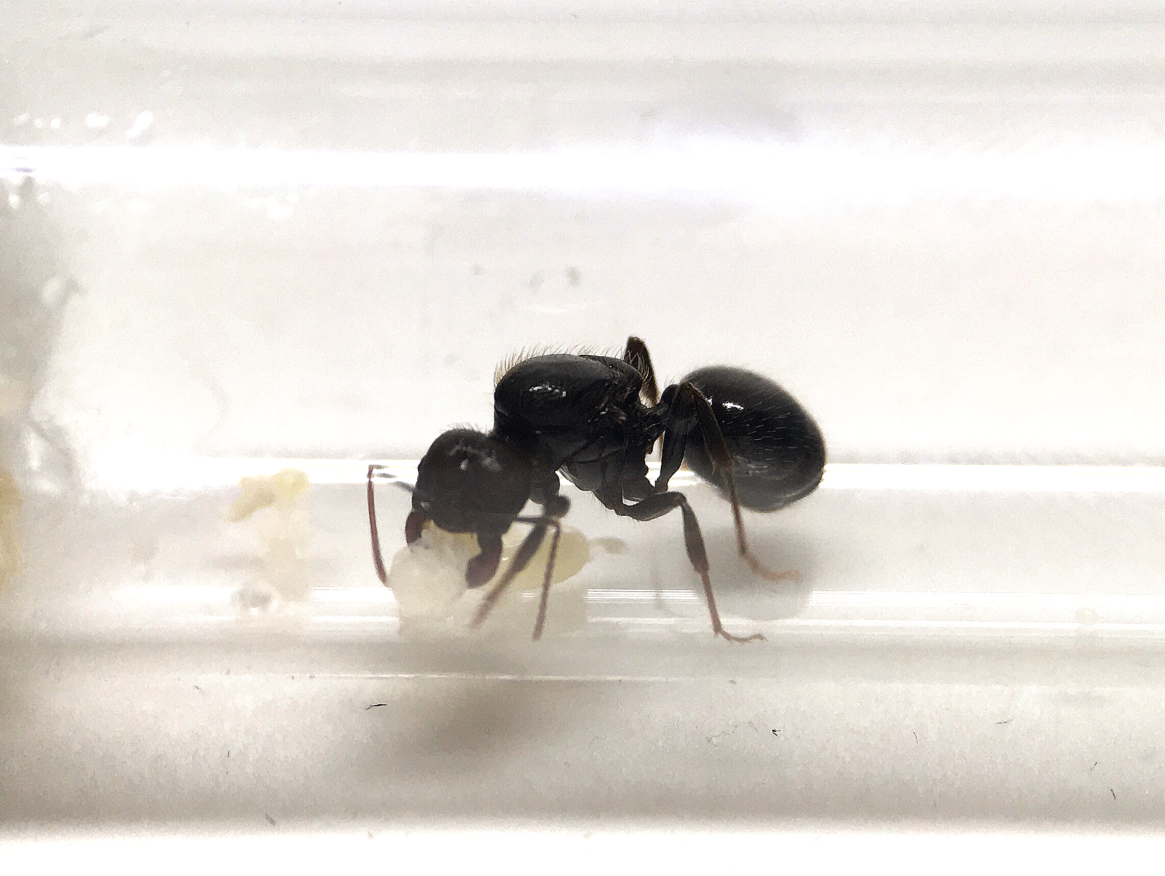 - Az első dolgozó megjelenéséig nem kell őt sem etetni. (Egy ici-pici darab diót be lehet mellé tenni, ha nagyon akarunk.) Később magkeverékből (pl. madár magkeverék) jutnak majd a dolgozók a szénhidráthoz (és némi fehérjéhez), rovar eleségből pedig fehérjéhez. (Rovarok helyett főtt tojással, vagy rántottával is lehet őket etetni fehérje bevitel végett.) Az édes dolgokat, mint cukros vizet, mézet más fajokkal ellentétben ők kevésbé kedvelik, de időnként érdemes azért próbálkozni vele. Nem közösségi gyomorból etetik egymást (mivel ennek a fajnak nincs), hanem „hangya kenyeret” készítenek az összerágott magvakból, és azt adják körbe. A nagyobb dolgozók megjelenéséig csak kisebb méretű magokat kapjanak, mint pl. mák, vagy chia mag.